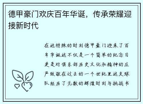 百年华诞不仅是对过去成就的肯定,更是对未来的一种激励和鞭策。德甲豪门将继续以高昂的斗志和坚定的信念迎接未来的挑战,力争在新的世纪里再创辉煌。无论前路如何,这支球队始终将以传承和创新为己任,继续书写属于他们的传奇故事。