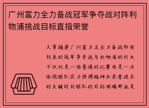 广州富力在备战与利物浦的冠军争夺战中,展现了全方位的备战态度。通过细致的战术部署、精心的阵容调整、充分的心理准备和灵活的临场应变,球队在面对顶级对手时,能够展示出自己的最大潜力。尽管利物浦是一支强队,但广州富力通过持续的努力,已经具备了与之抗衡的实力。在接下来的比赛中,球队将以拼搏的精神和对荣誉的渴望,全力以赴争取最好的结果。
