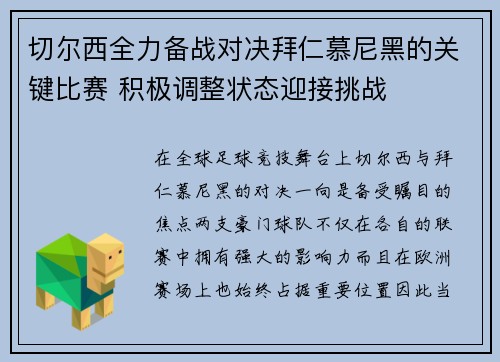 切尔西在备战对阵拜仁慕尼黑的关键比赛时,从球员状态的恢复与调整到战术层面的细致部署,再到球队凝聚力的提升和管理层的战略决策,每一方面的工作都在为这场比赛的胜利铺平道路。球队全力以赴,不仅仅是在竞技层面做足准备,更是在心理和团队层面进行深度的调整。切尔西在这场比赛中的积极备战体现了他们在面对强敌时的高水平和全力以赴的精神。
