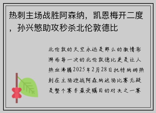 北伦敦的天空永远是那么的激情澎湃,而每一次的北伦敦德比更是让人热血沸腾。2025年2月28日,托特纳姆热刺在主场迎战阿森纳,这场比赛无疑是整个赛季最受瞩目的对决之一。赛前的分析和预测,所有的焦点都集中在两队的头号球星——凯恩和孙兴慜身上,而比赛的进程和最终的结果也再次证明了他们是热刺能够在北伦敦德比中获得胜利的关键。