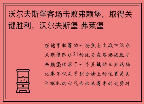 在德甲联赛的一场焦点之战中,沃尔夫斯堡队以2-1的比分在客场战胜了弗赖堡,收获了一个关键的三分。这场比赛不仅关乎积分榜上的位置,更关乎球队的士气和未来赛季的走势。对于沃尔夫斯堡来说,这场胜利的重要性不言而喻,特别是在面对一支状态正佳的弗赖堡时,能够顶住压力,逆袭成功,充分展现了球队的韧性和实力。