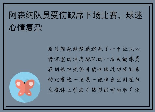 近日,阿森纳球迷迎来了一个让人心情沉重的消息:球队的一名关键球员在训练中受伤,可能会错过即将到来的比赛。这一消息一经传出,立刻在社交媒体上引发了热烈的讨论和广泛的关注。作为英超豪门之一的阿森纳,每一场比赛都承载着无数球迷的期待,而关键球员的缺席无疑会对球队的整体表现产生深远的影响。