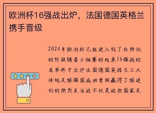 2024年欧洲杯已经进入到了白热化的阶段,随着小组赛的结束,16强战的名单终于出炉。法国、德国、英格兰三大传统足球强国成功晋级,赢得了球迷们的热烈关注。这不仅是这些国家足球的骄傲,更是他们坚韧不拔、奋力拼搏的象征。