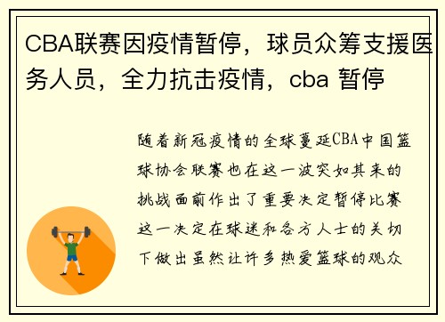 随着新冠疫情的全球蔓延,CBA(中国篮球协会)联赛也在这一波突如其来的挑战面前作出了重要决定:暂停比赛。这一决定在球迷和各方人士的关切下做出,虽然让许多热爱篮球的观众感到遗憾,但大家也能理解,这是为了保障所有人生命安全和健康所作出的必然选择。在比赛暂停的CBA球员们的行动并未停歇,他们迅速转向另一种“赛场”,为抗击疫情贡献自己的一份力量。
