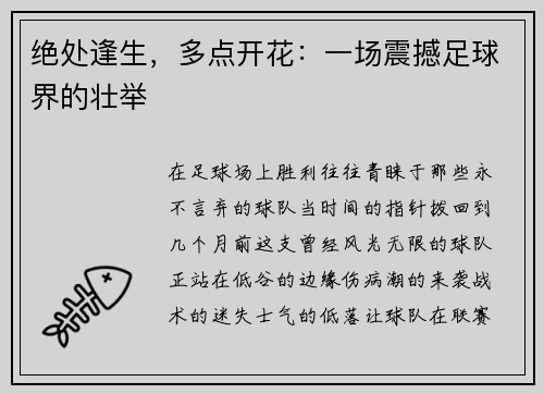 如今,这支球队已经成为了足坛的焦点,他们的“绝处逢生”和“多点开花”战术成为了人们津津乐道的话题。无论是球员、教练还是球迷,他们都为这段辉煌的历程感到自豪。这支球队用实力证明了,足球不仅仅是一项运动,更是一种精神的象征。他们的故事将被铭记,他们的精神将被传承,激励着一代又一代的足球爱好者。
