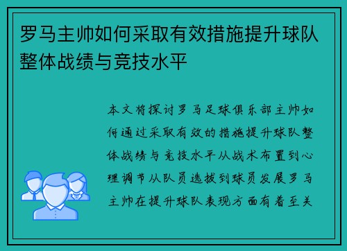 本文将探讨罗马足球俱乐部主帅如何通过采取有效的措施提升球队整体战绩与竞技水平。从战术布置到心理调节,从队员选拔到球员发展,罗马主帅在提升球队表现方面有着至关重要的角色。通过四个方面的分析——战术创新与调整、球队阵容的优化、球员个体发展与心理调节、以及文化氛围的塑造,本文将全面探讨主帅如何综合运用多种策略,提高球队的整体竞争力。每个方面都将具体阐述相关措施,并结合实际案例进行分析,最终总结出提升球队整体表现的关键因素。